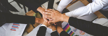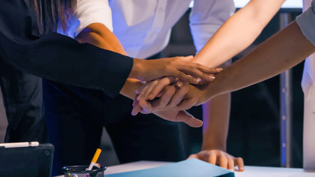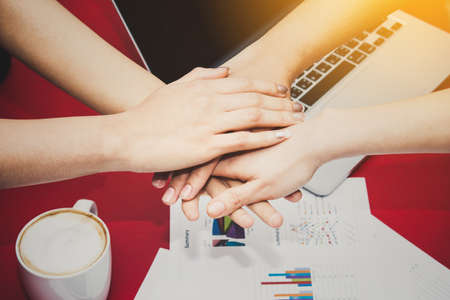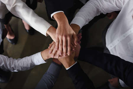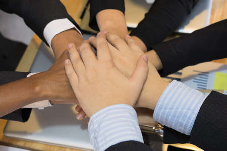 Close up top view of Business Partnership putting their hands together. Teamwork and Unity concept.