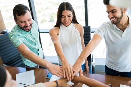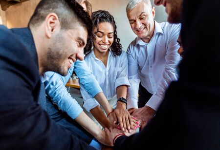 Teambuilding. Making hand stack of fists. Community spirit and friendship. Keeping high motivation. Happy diverse business team of employees celebrating success