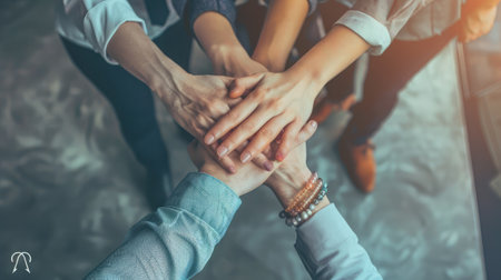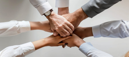 Diverse hands symbolizing teamwork, empathy, partnership, and social connection in business
