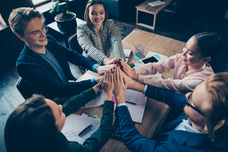 Top above high angle view nice luxury chic attractive elegant smart cheerful experts putting palms gathering over table desk desktop charts data at modern industrial loft interior work place station
