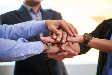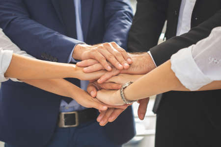 Close up hands of business people join hand together. Stack of hands. Successful teamwork of business together concept.