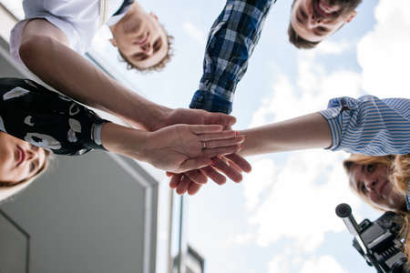 Close up of peoples hands, which they fold together so that the circle is formed as a symbol of unity. Students or a young team of startups go to a common goal. Concept of teamwork. Top view.
