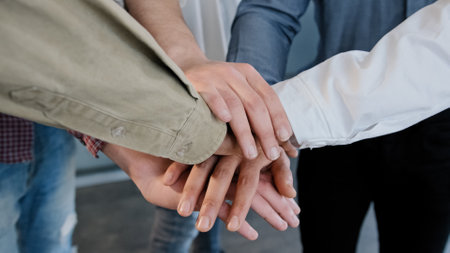 young diverse people standing with folded hands together. top view photo. friendship, partnership, togetherness.
