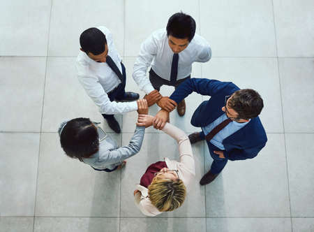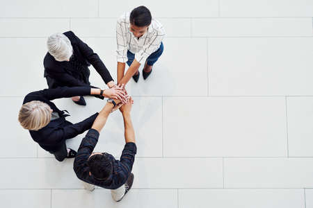 If we unite, we can conquer. High angle shot of a diverse group of businesspeople joining their hands together in unity.