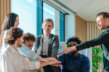 A diverse startup team in a modern office placing their hands together in a gesture of teamwork and solidarity, symbolizing unity, motivation, and a shared commitment to achieving goals.