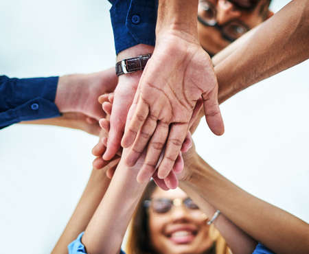 Theyre ready to go. Low angle shot of a group of unrecognizable businesspeople joining their hands together in unity.
