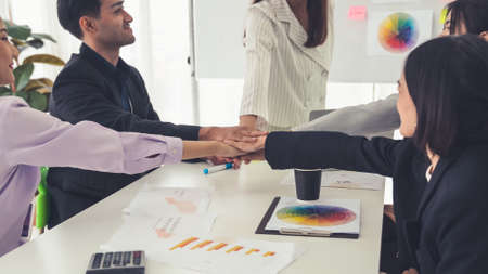 Group of Asian successful business people stacking hands together to cheer up team together in meeting, communicate, discuss, and working with colleagues in office. People lifestyle.Corporate teamwork