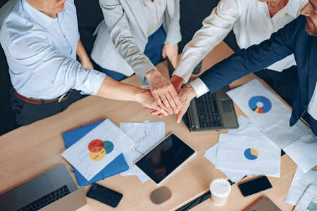 Successful team. Top view of business people holding hands together while standing in the office. Collaboration. Teamwork