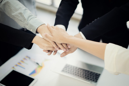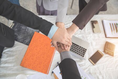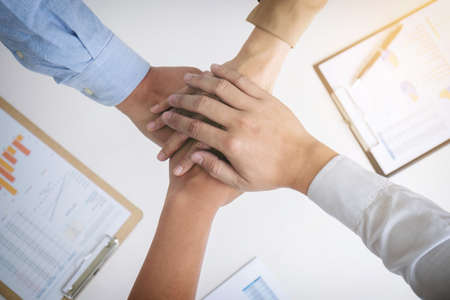 Close up top view of Business Partnership putting their hands together. Teamwork and Unity concept.