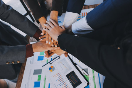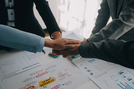 Businesspeople teamwork group putting their hands together agreement plan in meeting room, investment concept, success concept
