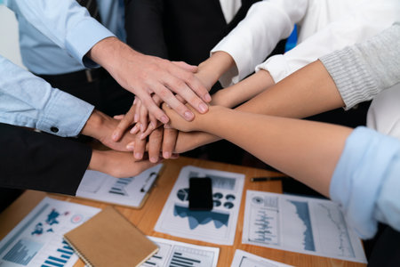 Multicultural business people holding hand together in circle. Unity teamwork in office business workplace. Diverse ethnic office worker engaged in team building. Meticulous