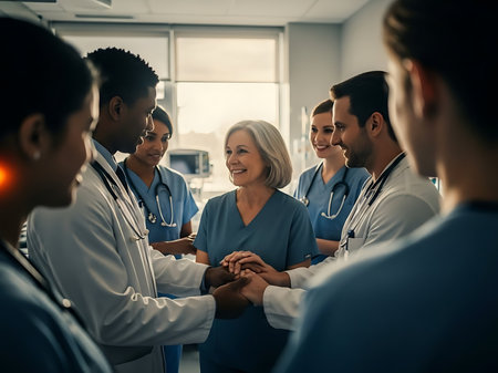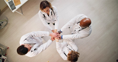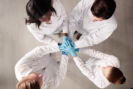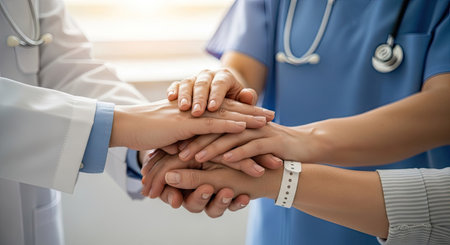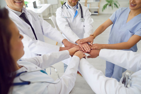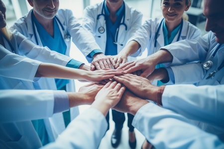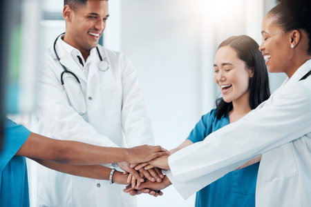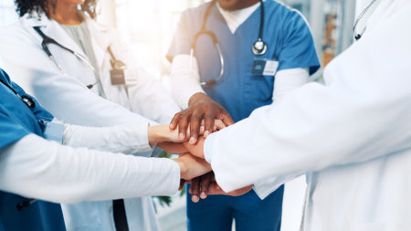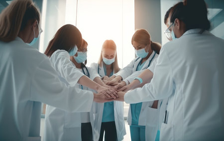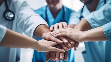 A close-up captures a group of medical professionals placing their hands together. The image showcases a diverse set of individuals in medical attire, including lab coats and scrubs. The composition emphasizes the collaborative and supportive nature of healthcare, with a soft focus and warm lighting suggesting a positive and optimistic environment. It could be used in healthcare-related marketing or editorial contexts.