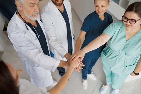 Group of doctors putting hands together in clinic, top view. Unity concept