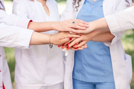 Cooperation of doctors and nurses in a medical team stacking hands.