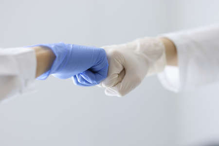 Doctors in rubber gloves touching their fists in clinic close-up. Health care workers cooperation concept