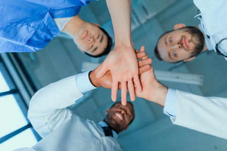 close up. group of different doctors putting their hands together
