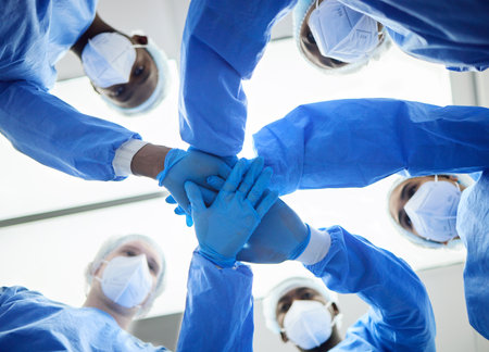 Group of professional medical team of doctors putting their hands together. Top view