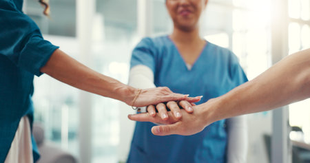 Closeup, nurses and doctors with handstack in hospital for celebration, surgery success and victory. People, healthcare workers and huddle for medical milestone, staff motivation and team achievement