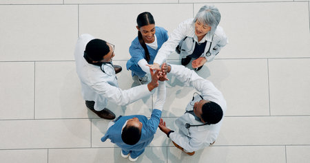 Saving lives with our skills combined. High angle shot of a group of medical practitioners joining their hands together in unity.