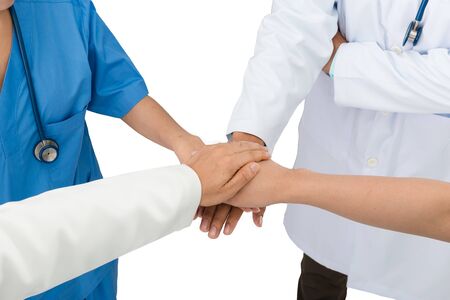 Group of professional medical team of doctors putting their hands together