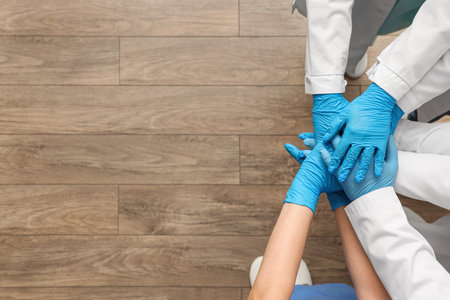 Doctors in medical gloves holding hands at clinic, top view