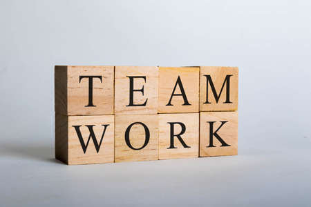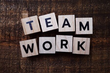 Wooden cube elements with letter on wooden table, which represents teamwork. Business concept.