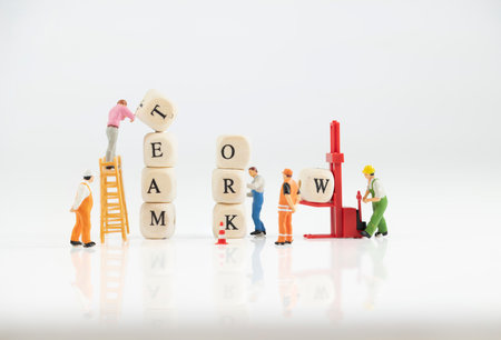Teamwork concept. Miniature builders figure with wooden blocks with “TEAMWORK†wordings
