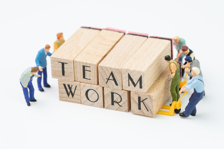 Teamwork concept idea, miniature people figurine work as team helping each other to build or develop wooden stamp combine the word Team work, challenge for business success.