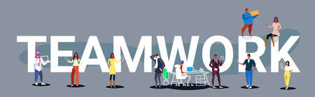 businesspeople team working together with big word teamwork concept men women creative team project discussion sketch doodle horizontal banner vector illustration