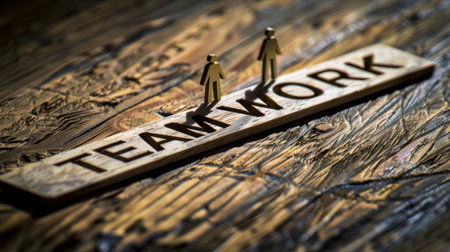 Two small golden figures stand on a rustic wooden surface, next to a sign that reads Teamwork.