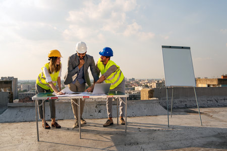 Top view of contractors, engineers and formats team in safety vests with helmets working with laptops, standing on under-construction building site. Banner cover design. Home building project.