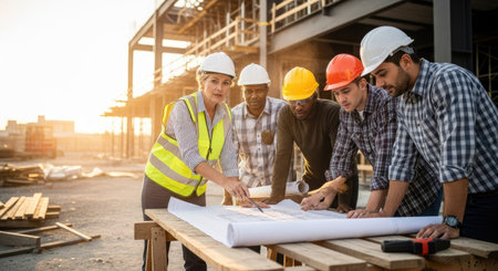 Construction workers in safety gear collaborating on scaffolding at a building site, showcasing teamwork, diversity, and professional interaction