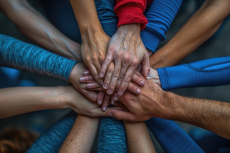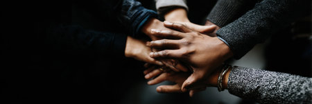 Diverse hands symbolizing teamwork, empathy, partnership, and social connection in business