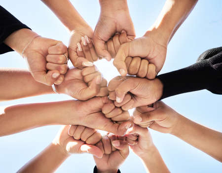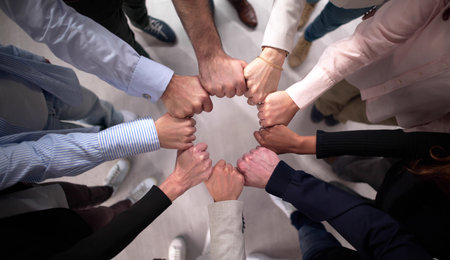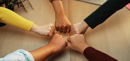Four fists, representing diverse individuals, are touching in a gesture of unity and agreement. The hands are positioned in the center, symbolizing collaboration.