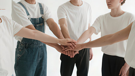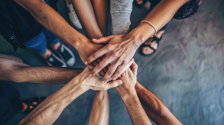 Close up top view of young people putting their hands together. Friends with stack of hands showing unity and teamwork. --ar 16:9 Job ID: c9f6f4df-26f5-477c-91f8-063c7004d700