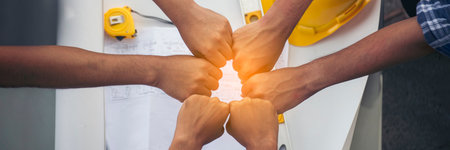 Banner Close up engineer men hands diversity multiethnic partners team together. Group of multiracial engineer Manager Foreman Teamwork meeting. Top view team join hands partnership with copy space