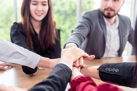 Group of business people putting their hands working together on wooden background in office. group support teamwork agreement concept.