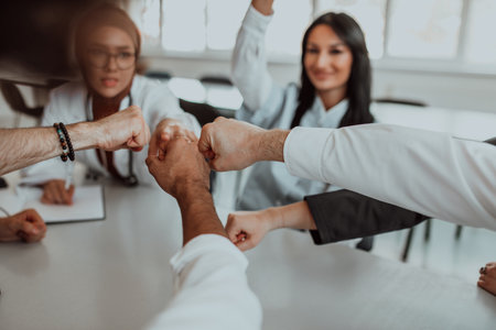 Successful colleagues put their naughty hands with fists together in the financial business idea office.
