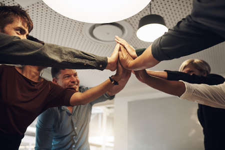 Teambuilding. Making hand stack of fists. Community spirit and friendship. Keeping high motivation. Happy diverse business team of employees celebrating success