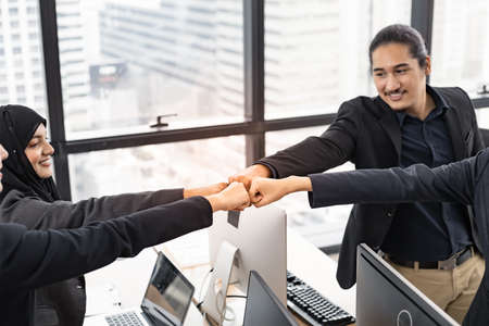 Successful of group business people fist bump together at office.success mission team meeting.Friendship teamwork concept