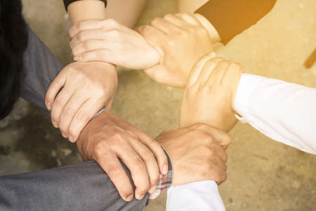 Teamwork business join hand together concept, Image of hands in circle as symbol of their partnership and teamwork,we will do the best concept, Volunteer charity work. People joining for cooperation success business.