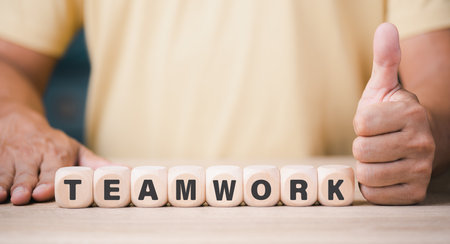 Wooden block cube with alphabet text TEAMWORK on wood table. Working together in organization for sustainable success. teamwork and partnership concept.