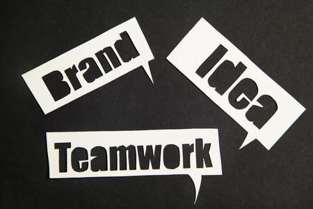 Teamwork, brain storm, words in wooden alphabet letters in crossword form isolated on purple background