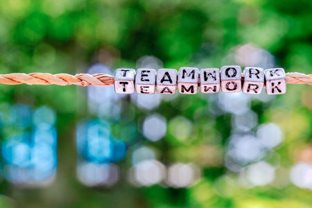 Teamwork word hanging by rope with beautiful green nature bokeh background with vintage retro tone. Cooperation, togetherness, partnership concept.