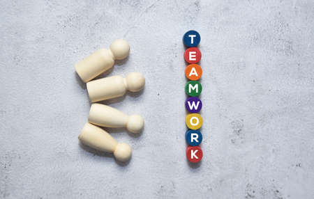 Wooden dolls with TEAMWORK text on circle colorful wooden blocks.