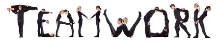 Group of people forming the word 'TEAMWORK', isolated on white background.
