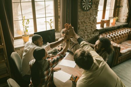 Highfive Of Young Freelancers Team, Diverse Ethnicity Coworkers Group Gives Highfive Gesture While Sitting Together At Table In Loft Office, Team Building Concept, High Angle View