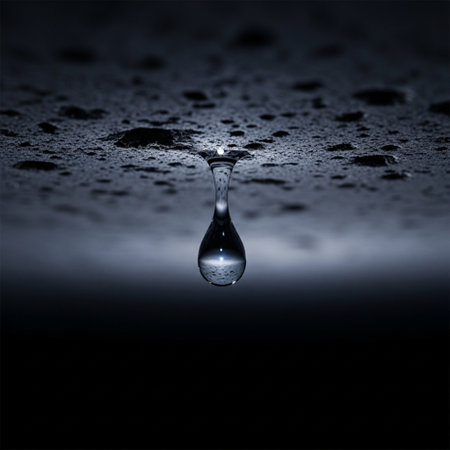 A captivating close-up image of a single water drop suspended in darkness. The drop reflects light and creates a serene atmosphere, perfect for various projects.