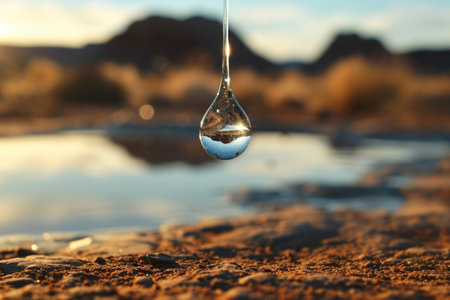 Isolated Water Droplet in the Desert: A captivating photograph showcasing a solitary water droplet defying gravity in the midst of a desolate desert,