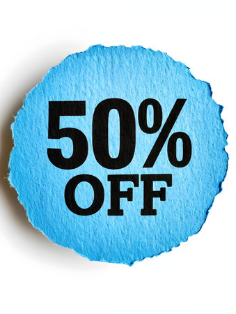 Black '50% OFF' Text on a Blue Round Paper Note. White Background